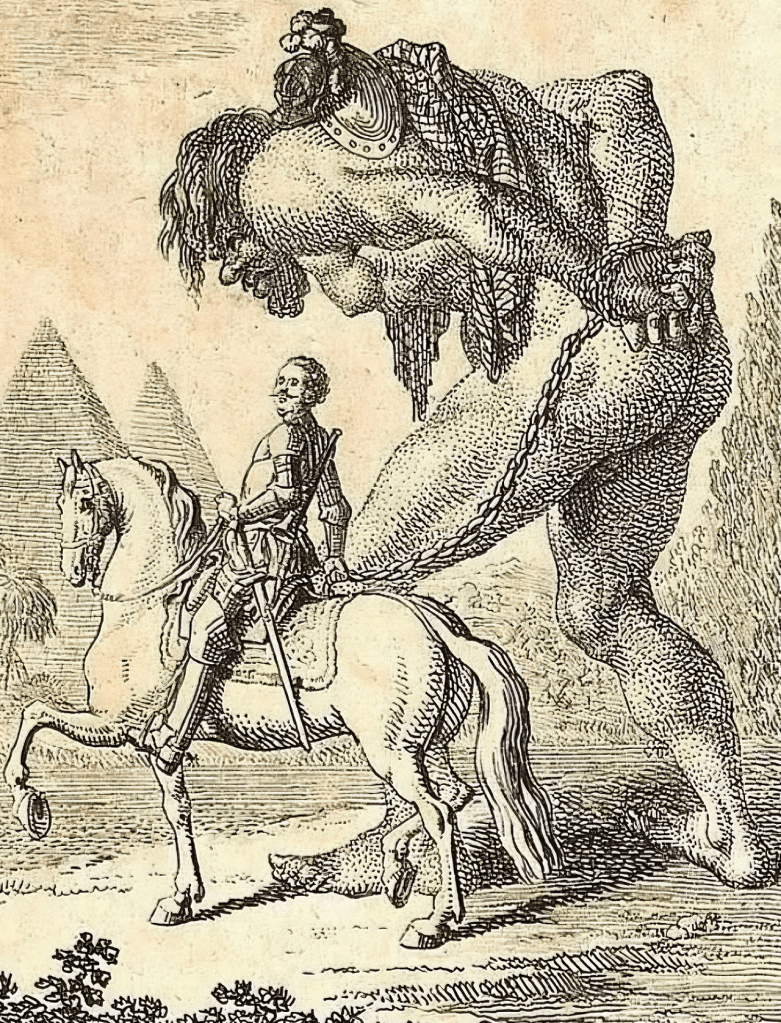 오를란도 푸리오소 Orlando Furioso의 15번 칸토Canto Fifteen에서 영감을 받은 이 장면은 용감한 아스톨포Astolfo가 자기 말을 타고서 포획한 거인 칼리고란테Caligorante를 의기양양하게 끌고 가는 모습을 포착했다.