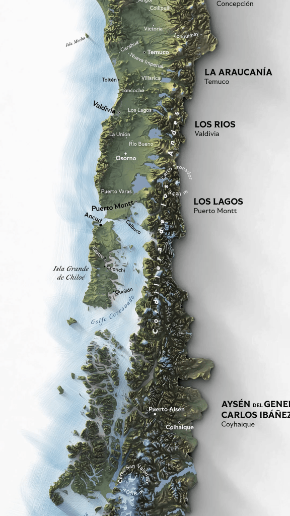더 남쪽으로 내려가 로스 라고스Los Lagos와 아이센Aysén과 같은 지역에서는 강우량이 급격히 증가한다.