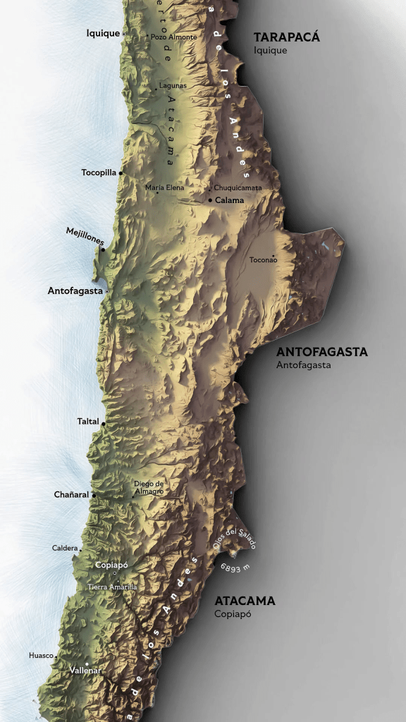 북쪽 끝에는 지구상에서 가장 건조한 극지방이 아닌 아타카마 사막Atacama Desert이 있는데, 일부 기상 관측소에서는 연 강수량이 1mm 미만으로 기록된다.