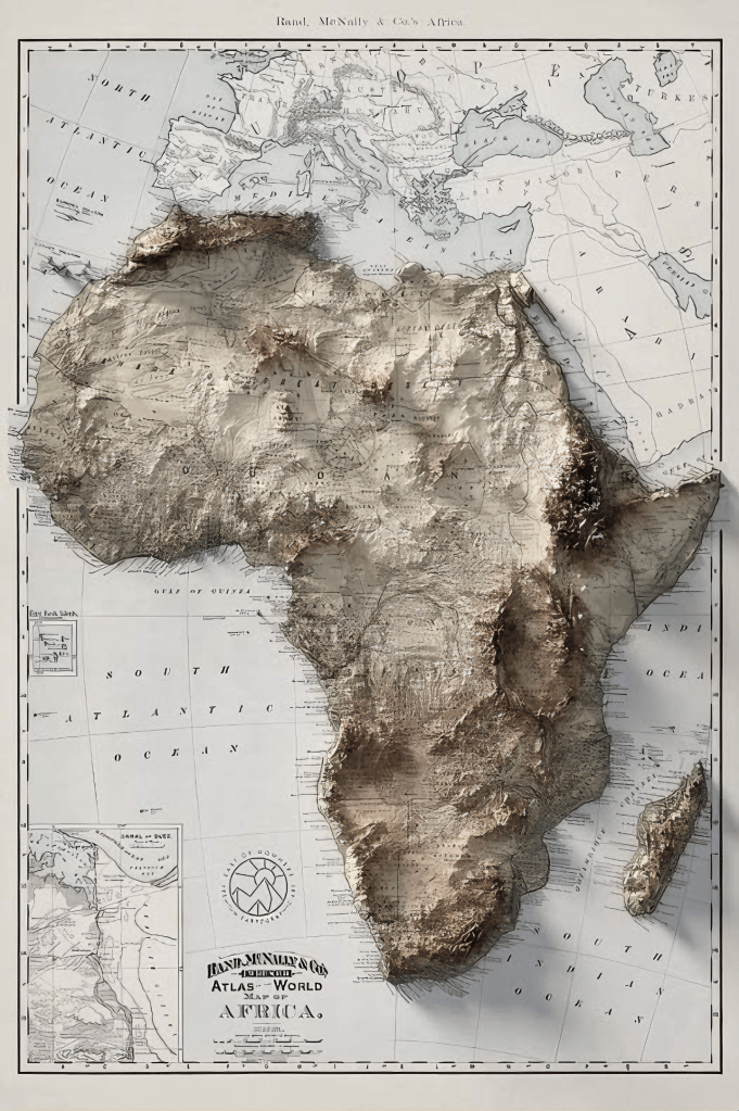 opographical map of Africa 1879, 곧 등고선 개념이 드러나는 1879년 아프리카 지도인데 측량술이 발달한 지금은 저 지도가 더욱 정교해졌고 많은 수정이 있겠지만 그래도 저만으로도 아프리카 지형적 특징이 유감없이 드러난다.