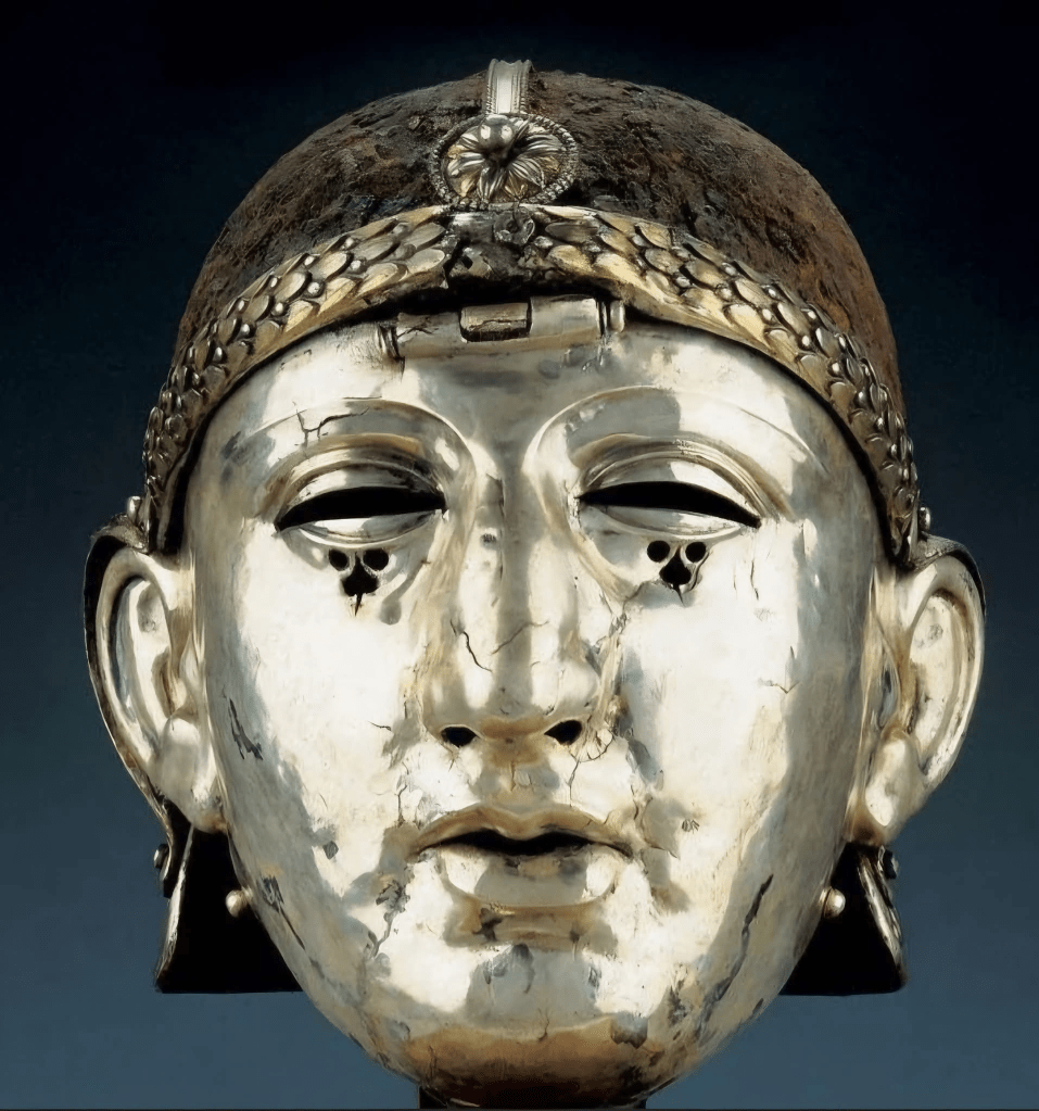 이 헬멧은 철제 머리 부분과 얼굴 가면으로 구성되며, 후자는 은판으로 덮여 있어 소유주일 가능성이 높은 개인화한 얼굴 초상화를 보여준다.