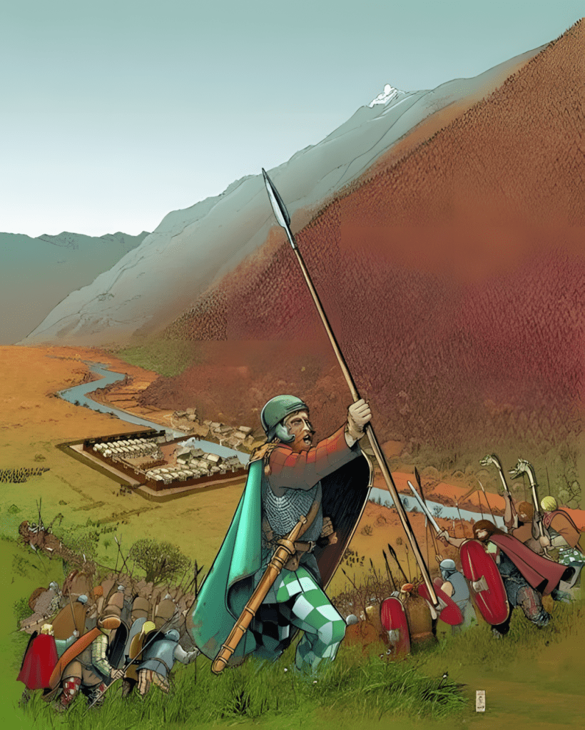 곡물도 아직 들어오지 않았고, 요새도 완공되지 않은 어느 날 아침, 그의 정찰병들이 마을 사람들이 모두 마을 절반을 떠났고, 마을 양쪽으로 우뚝 솟은 산들이 베라그리족Veragri과 세두니족 Seduni 전사들로 갑자기 가득 차 있다는 보고를 했기 때문이다.