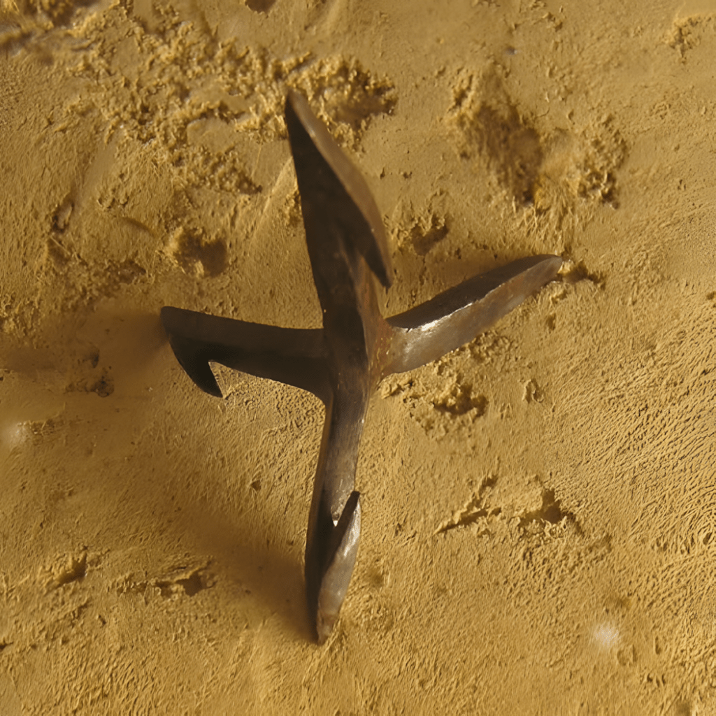 각각 약 7.5cm 길이 네 개 못이 난 이 마름쇠는 가죽 샌들이나 부츠를 뚫거나 맨발의 병사를 즉시 움직일 수 없게 만들었다.