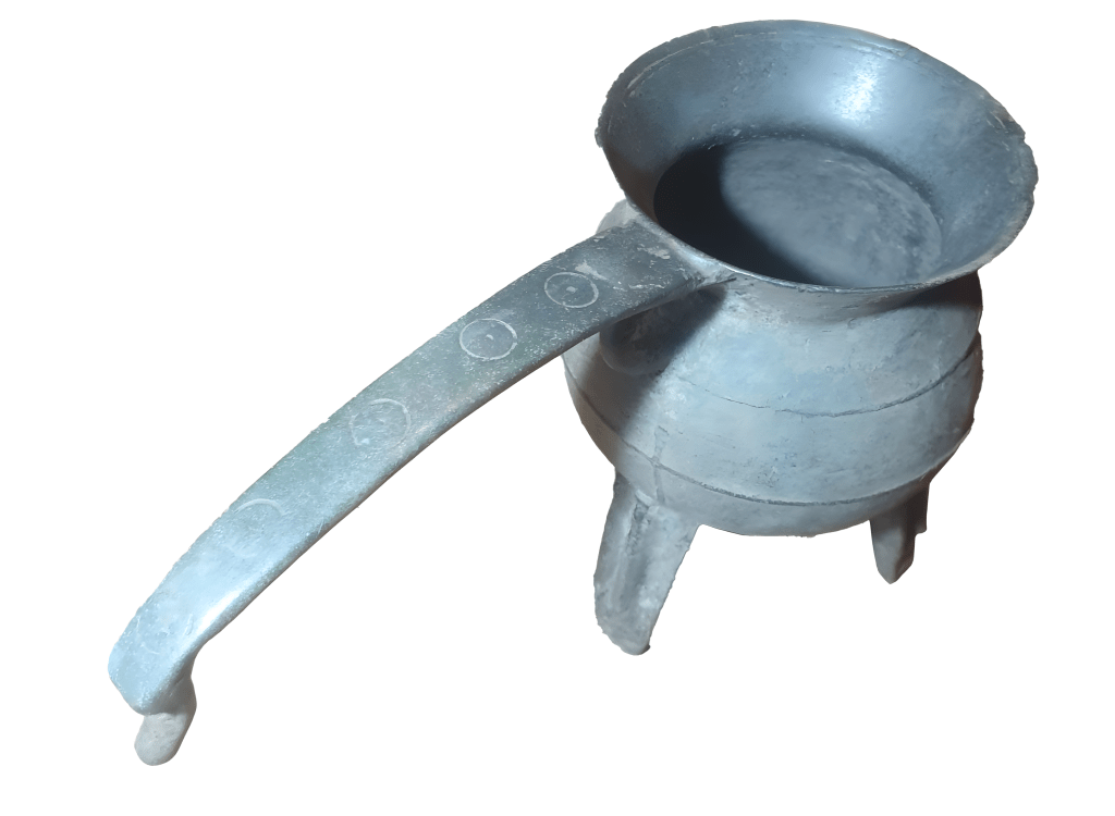 이 유물은 포스넷posnet으로, 세 개 다리와 긴 손잡이가 있는 작은 냄비다. 모닥불 위에서 음식을 조리하는 데 사용했다.