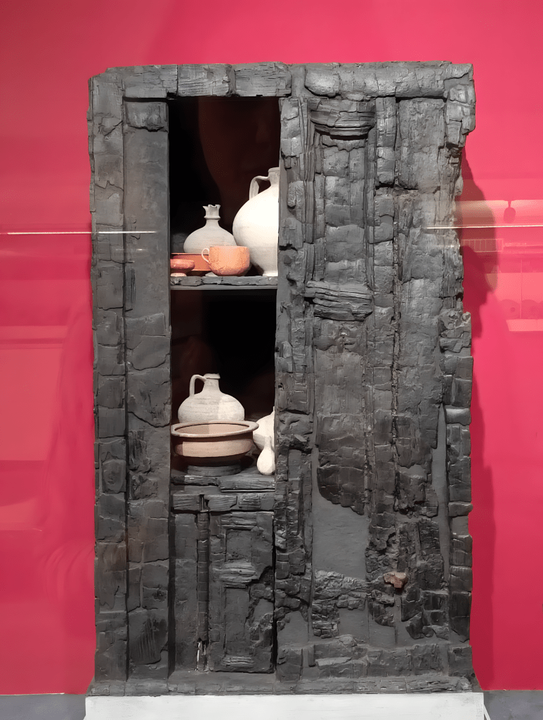 발견된 지 거의 90년 만에, 데쿠마누스 막시무스Decumanus Maximus의 V, 8번 아파트에서 발견된 이 특별한 나무 사이드보드와 식기 세트가 헤르쿨라네움Herculaneum 고고학 공원 고대 목재 전시관에 전시되었다.