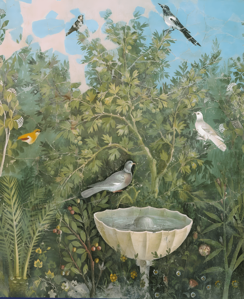 정원 그림의 매우 정확한 예로, 사실적인 효과를 만들어내며 당시 여러 종 새를 알아볼 수 있게 한다.