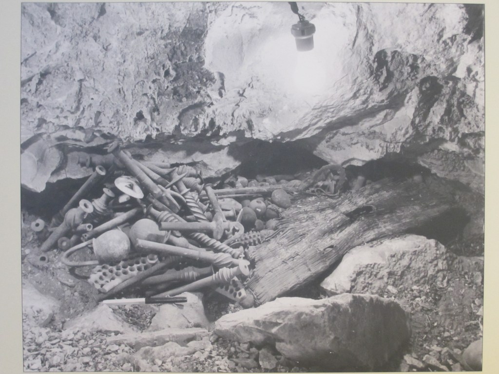자연 틈새 잔해 아래에서 발견된 짚으로 만든 돗자리에 싸인 이 유물에는 442점 유물이 담겨 있었다.
