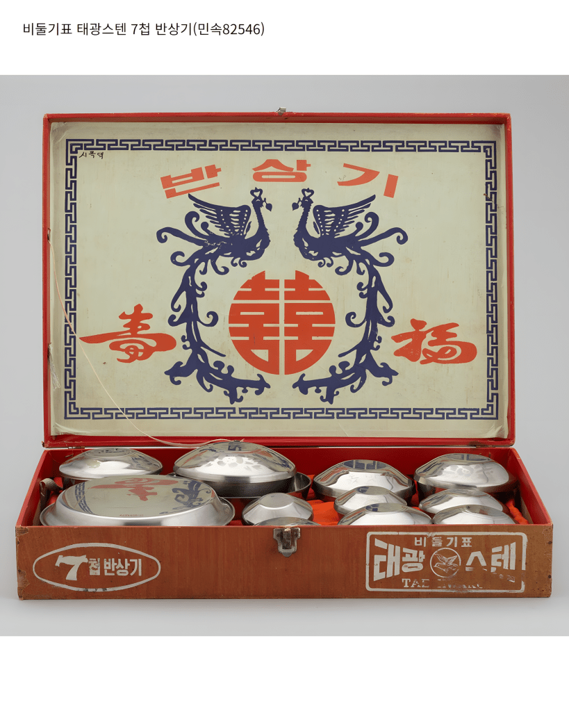 붉은색 나무 상자를 열면 무엇이 들어 있을까요? 상자 안에는 스테인리스로 만든 밥그릇, 주전자, 대접, 쟁첩*, 종지 등 음식을 담는 여러 종류의 그릇이 담겨 있습니다. 그런데 가만 보니 밥그릇이 두 개입니다. 아마도 두 사람, 신혼부부를 위한 것이 아닐까 합니다.