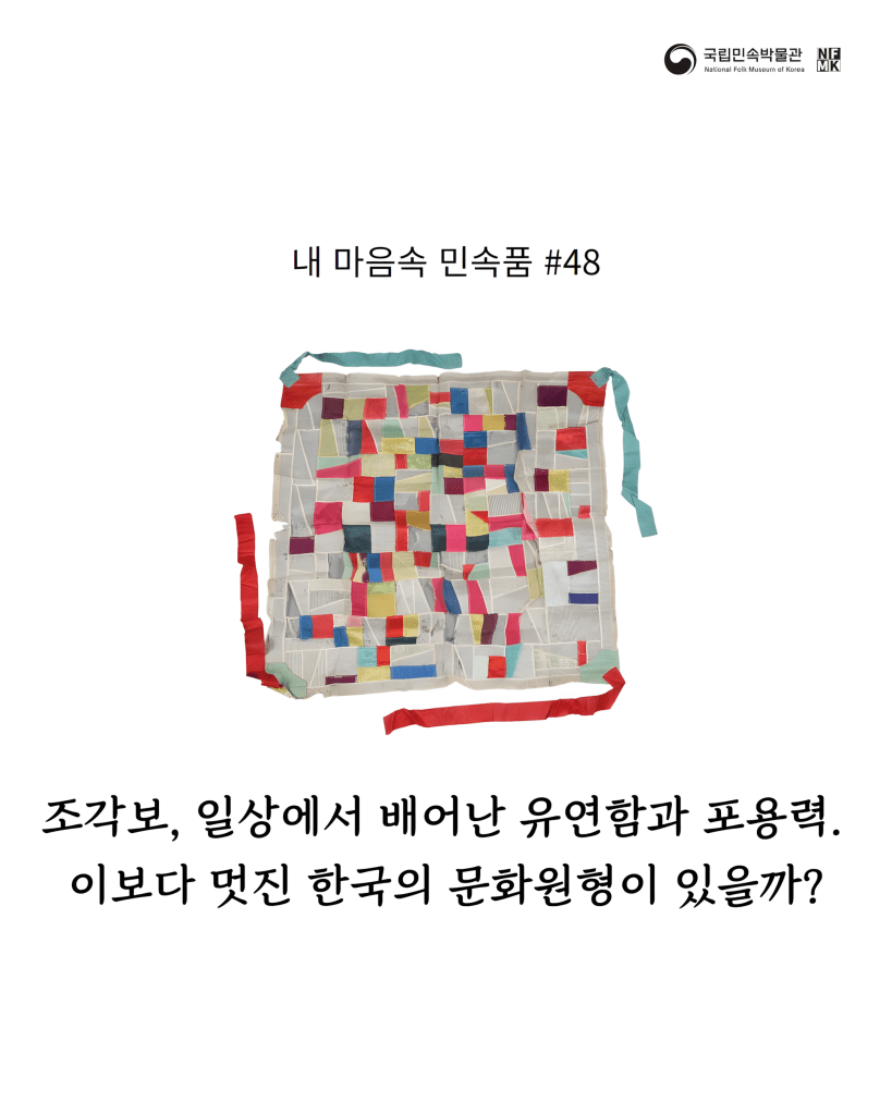 故 이어령 박사님의 통찰에 따르면 “일본의 문화는 란도셀(책가방)이고 우리의 문화는 보자기다”라고 하셨습니다. 보자기는 덮으면 덮개가 되고, 쓰면 쓰개가 되고, 바닥에 깔면 깔개가 됩니다. 책을 싸면 책가방이 되고, 창문에 치면 커튼이 됩니다. 어깨에 두르면 슈퍼맨 날개가 되는 기억도 유년 시절 한 번쯤은 있을 것입니다. 동그란 물건을 싸면 동그래지고, 네모난 물건을 싸면 네모가 되는 보자기의 유연함과 포용력을 박사님께서는 서양과 대비되는 한국 문화의 원형이라고 하셨습니다. 이는 우리 박물관에도 대입할 수 있는 무릎을 ‘탁’ 치게 하는 통찰이었습니다. 그래서 새 MI를 위한 심볼을 보자기로, 그중에서도 협업과 조화를 상징하는 조각보를 모티브로 디자인했었습니다.