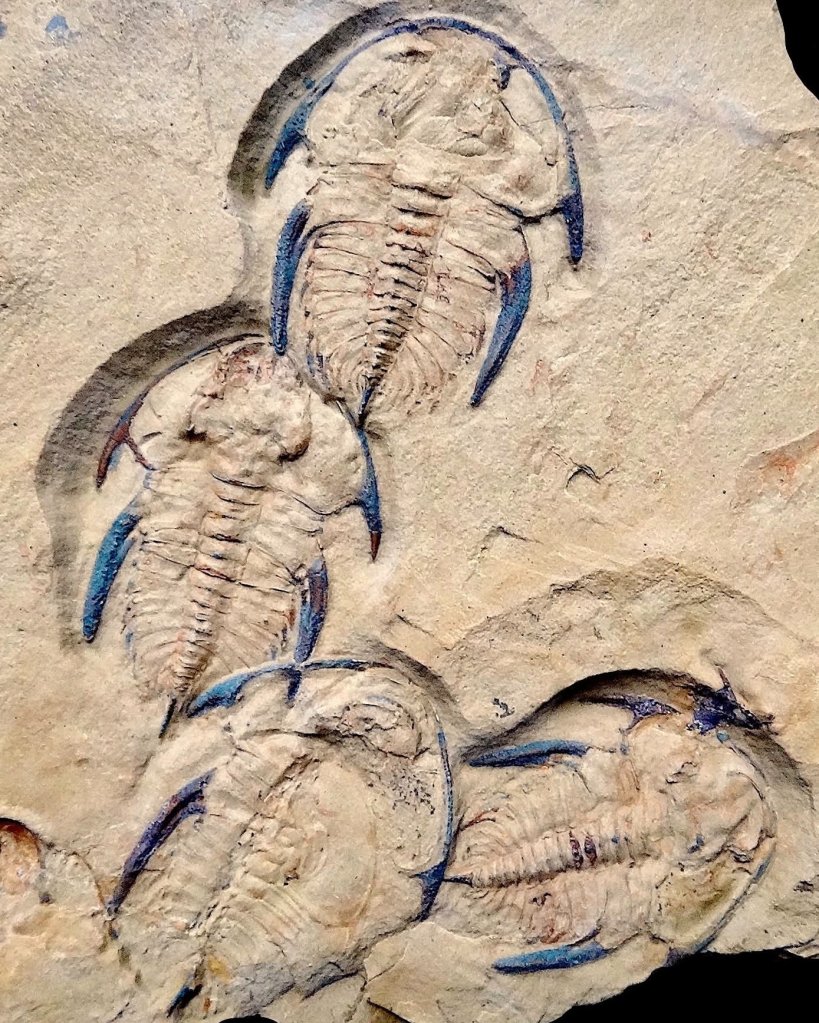 Frozen in motion for nearly 500 million years, this rare fossil captures a group of trilobites crawling together across the prehistoric seabed. Their elongated, segmented bodies — marked by delicate ridges and subtle blue hues along the edges — reveal extraordinary detail from a time when complex life was just beginning to flourish in Earth’s oceans.