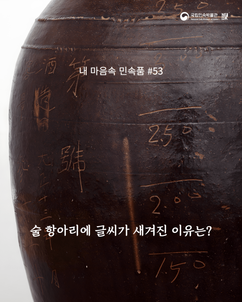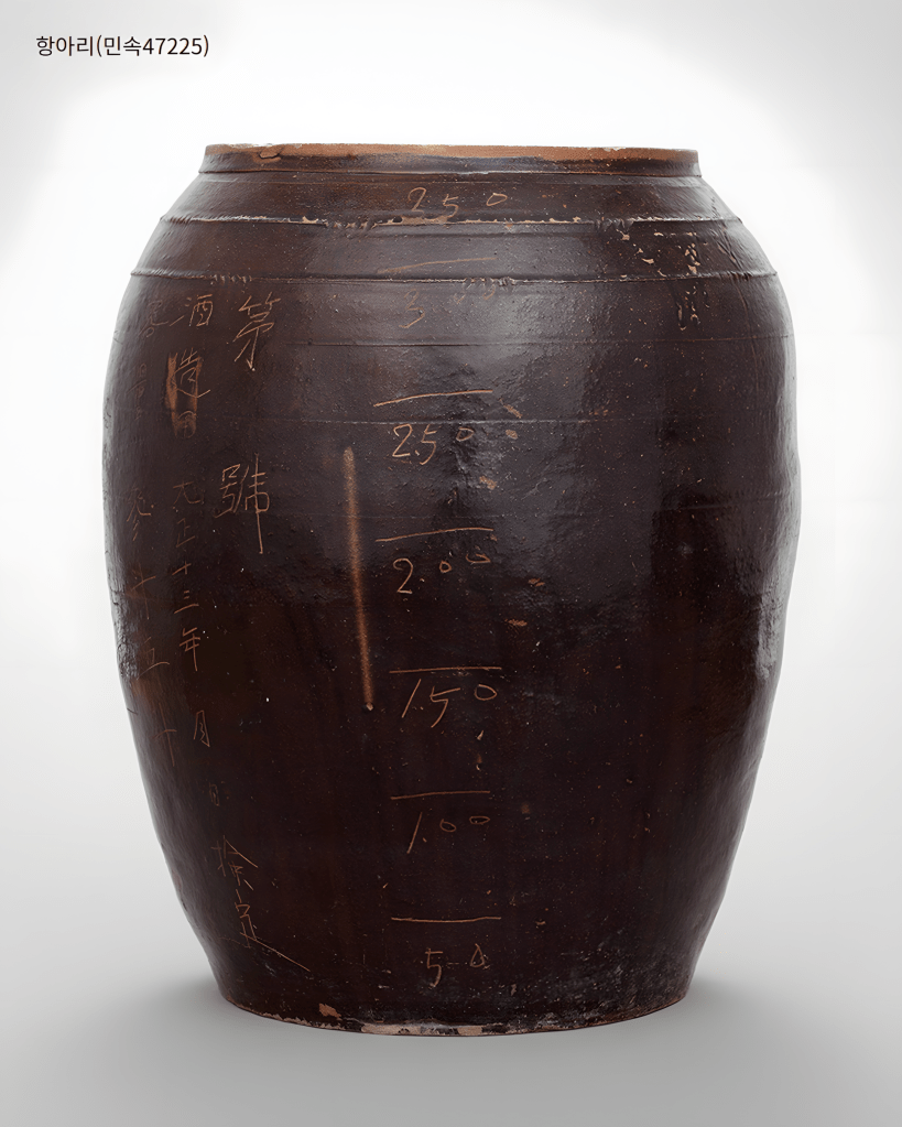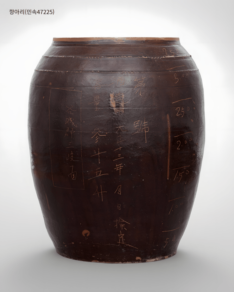 국립민속박물관 파주 열린 수장고(6 수장고)에 가보면, 유난히 눈길을 끄는 항아리 하나를 볼 수 있습니다. 표면에는 투박한 글씨와 일정한 간격의 선과 숫자가 새겨져 있습니다. ‘第 號’, ‘酒造用 大正十三年 ○月 ○日檢定’, ‘容量 參斗五升’, ‘50, 100, 150, 200 …’ 과연 이 글씨들은 무엇을 의미할까요?