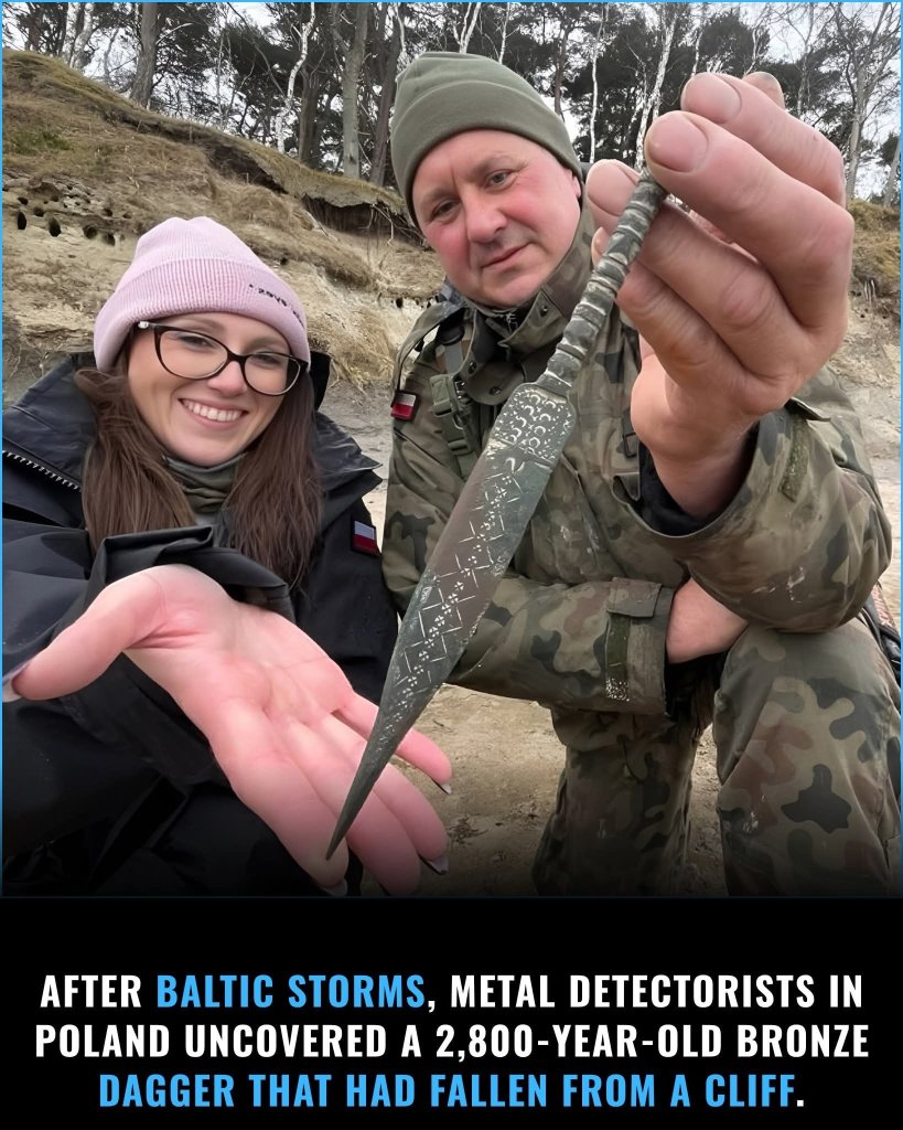 발트해를 따라 연이은 강력한 폭풍우 이후, 폴란드 북부 두 금속 탐지기 사용자는 해안 절벽에서 떨어진 2,800년 된 청동 단검을 발견했다.