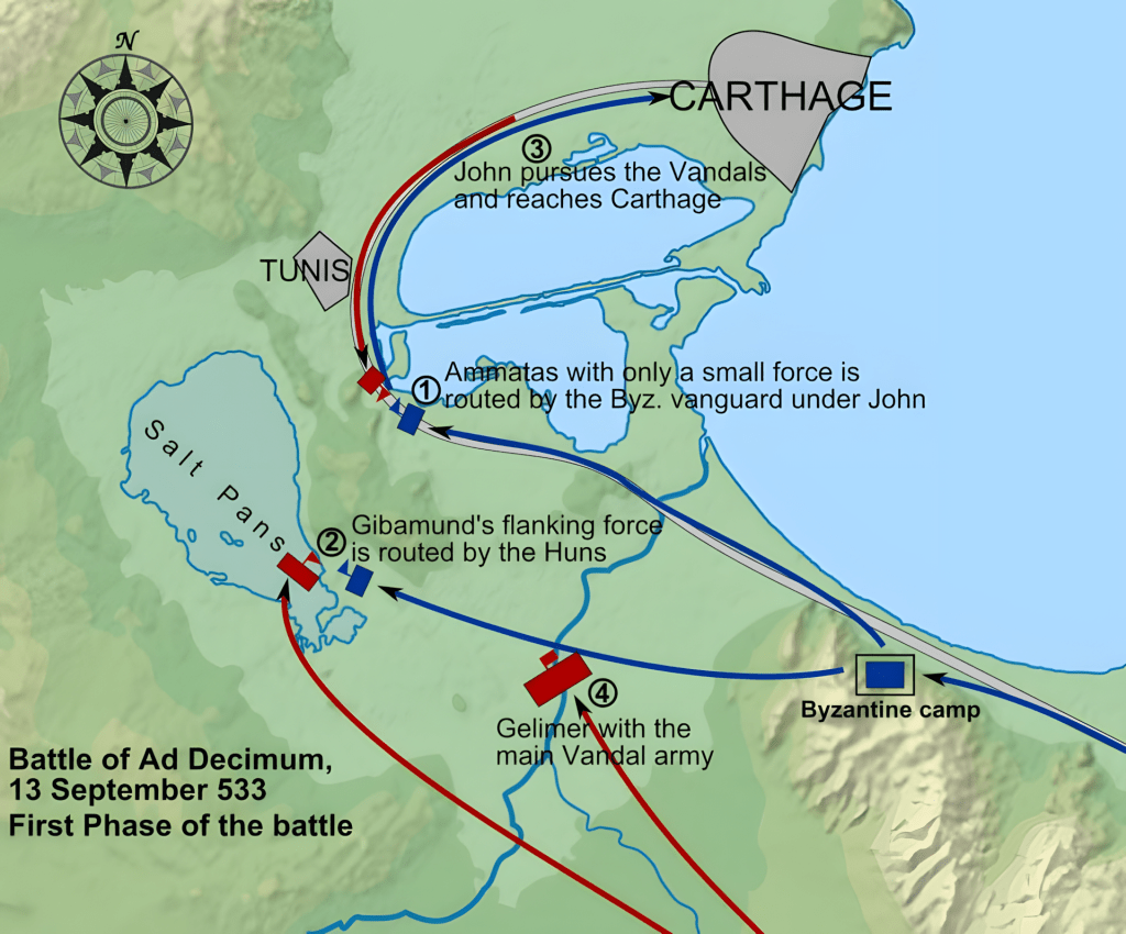 The Battle of Ad Decimum took place on September 13, 533 between the armies of the Vandals, commanded by King Gelimer, and the Byzantine Empire, under the command of General Belisarius.