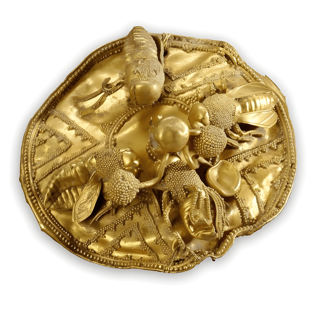 The Etruscan gold disc with bees (c. 700-600 BCE) is a notable artifact housed in the collection of the Nasher Museum of Art at Duke University. This ancient piece of jewelry, potentially worn as a pendant or a component of a fibula (a type of brooch), is celebrated for its intricate craftsmanship.