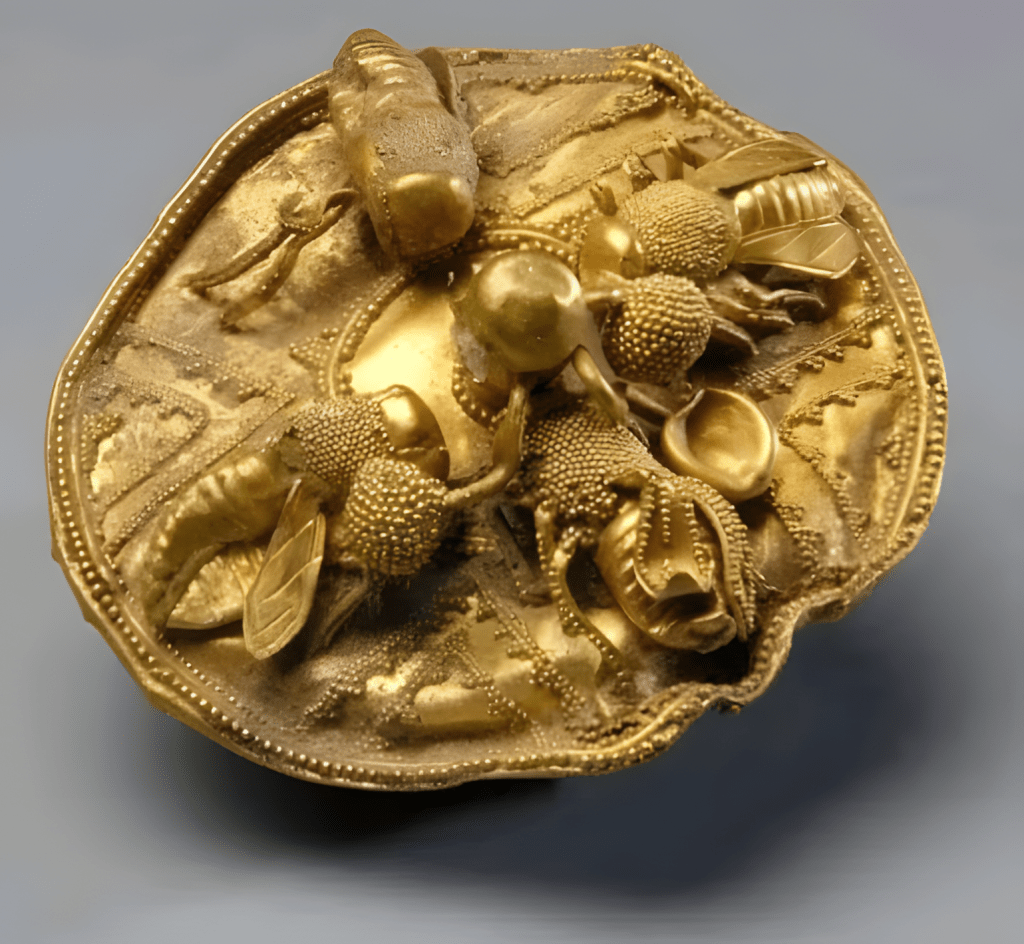 기법: 이 판에는 레푸세repoussé (뒷면을 두드려 만든 부조hammered relief from the reverse side), 조각, 그리고 과립화granulation (작은 금구gold spheres를 정교하게 접합하는 기법) 등 다양한 기법을 결합하여 제작한 네 마리 벌을 새겼다. 동지중해 지역 에트루리아인들이 채택한 과립화 기법은 그들의 금 세공 기술을 여실히 보여준다.