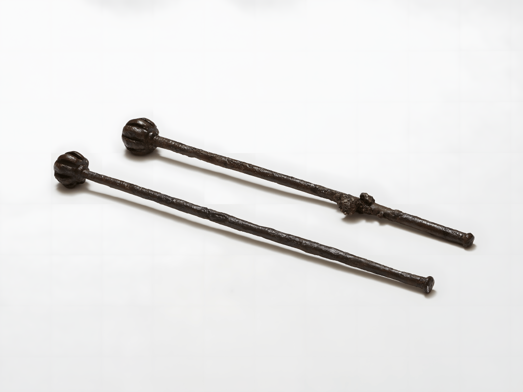 These are two iron maces from the Joseon Dynasty era (1392-1910 AD) housed at the Seoul Baekje Museum in Seoul, the capital of South Korea.