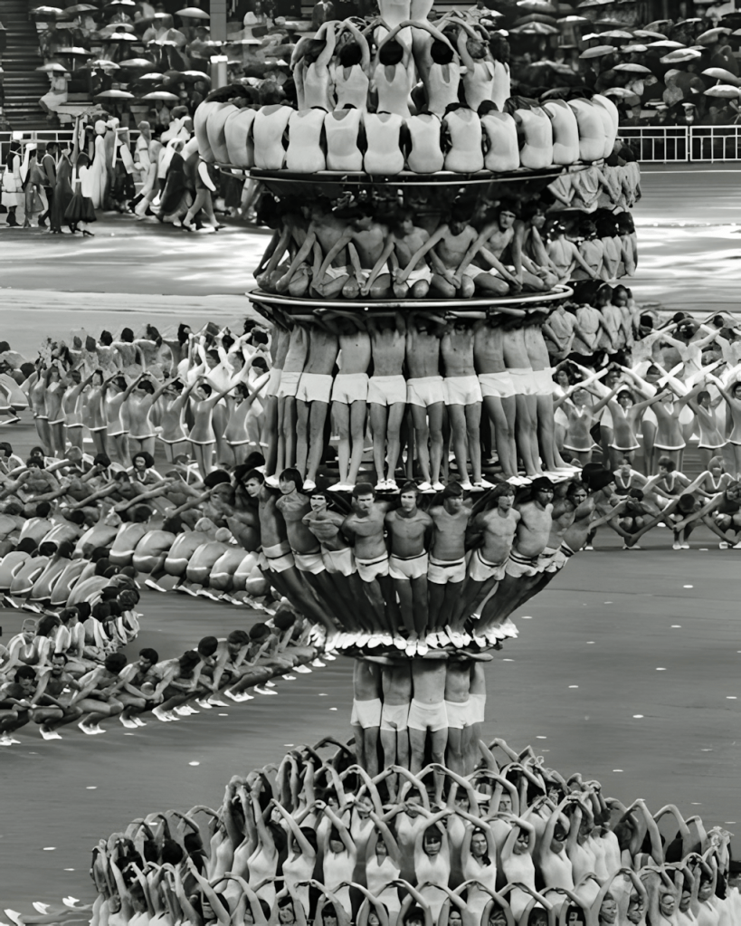 Through precise, synchronized movement, the performers symbolized fire and light, blending artistry with athleticism and national pride. The display perfectly reflected the Soviet Union’s focus on spectacle, collective achievement, and unforgettable moments — leaving a lasting impression on audiences around the world.