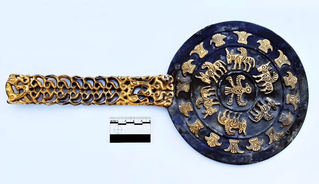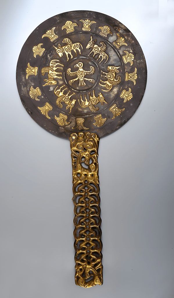 The mirror was cast from high-tin bronze, an alloy sometimes referred to as “white bronze” due to its pale, silvery appearance and high reflectivity. Unlike utilitarian bronze, this material is brittle and difficult to work, indicating that the mirror was never intended for everyday use. Its openwork handle, richly decorated and gilded with gold, further emphasizes its prestige and ceremonial function.