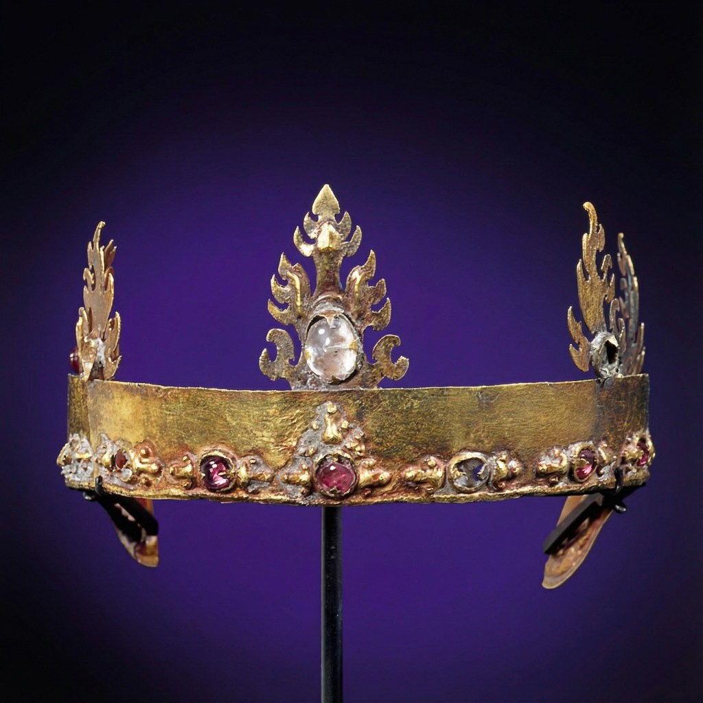 사진: 루비와 수정이 박힌 금 주조 및 세공 왕관으로, 다섯 개 불꽃 문양이 장식된다. 크메르 이전Pre-Khmer 시대, 타케오Ta Keo 지역, 8세기 말/9세기 초. 지름 8cm. 런던 다나트 제공.