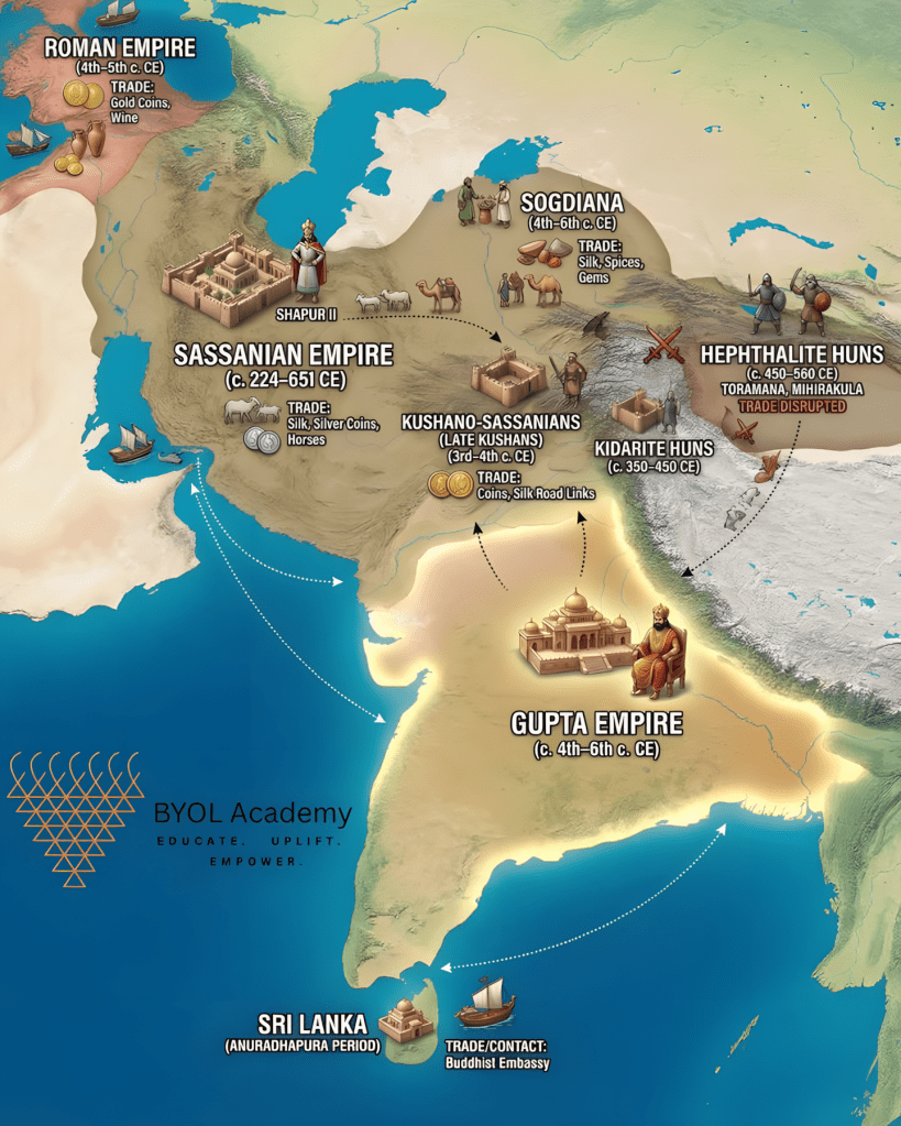 무역 네트워크, 화폐 유통, 문화 교류를 통해 관계가 지속되었으며, 이는 굽타 시대에 인도를 더 넓은 유라시아 체제에 통합하는 데 기여했다.