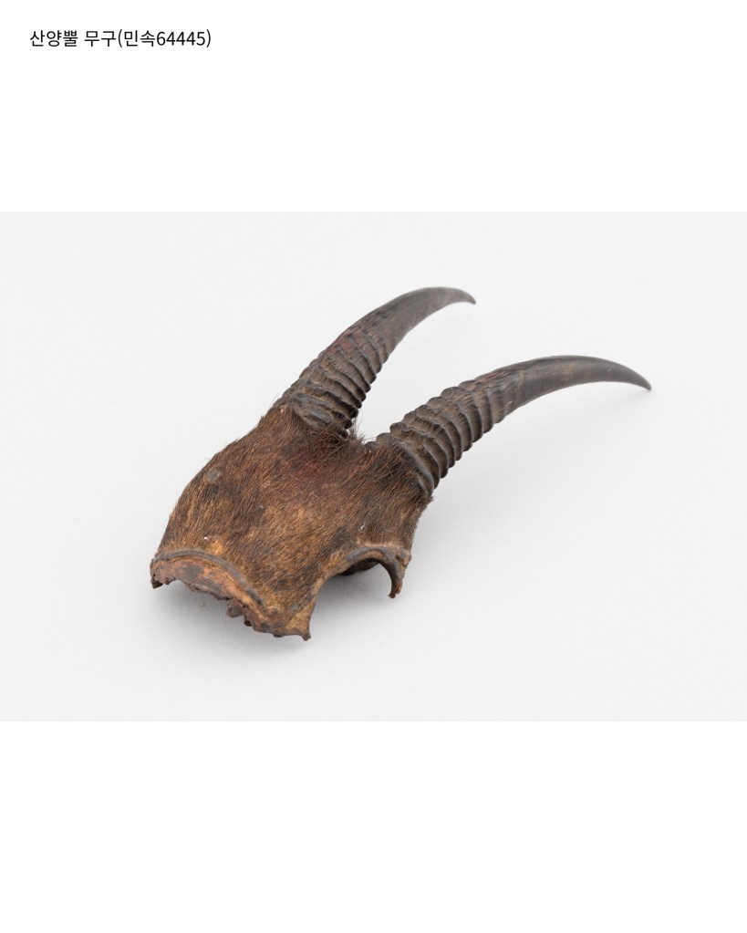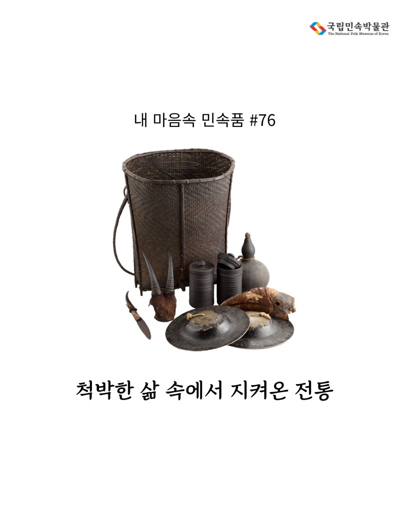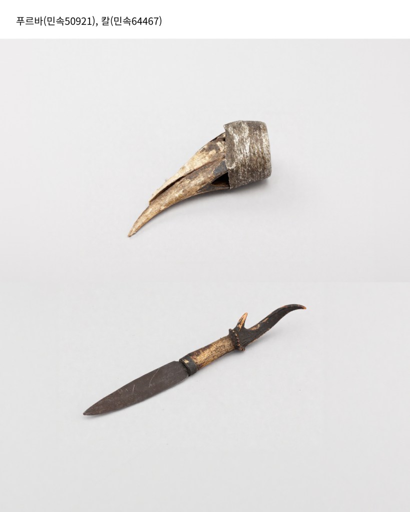 소장품 정보: 산양뿔 무구(민속64445), 바라(민속64455), 호리병(민속64472), 칼(민속64467), 푸르바(민속50921), 바구니(민속64485), 술병(민속64477, 64478)