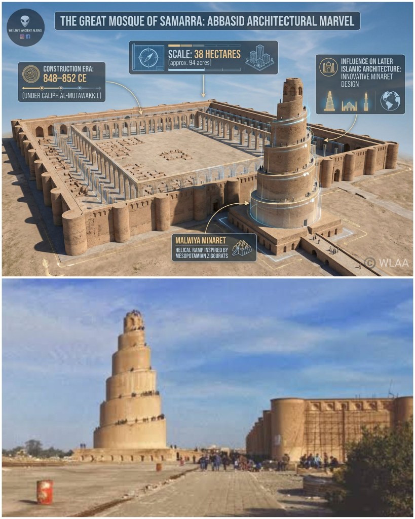 The mosque’s scale and layout reflect the political power and architectural ambition of the Abbasid Caliphate at its height, while its innovative minaret form influenced later Islamic architecture.