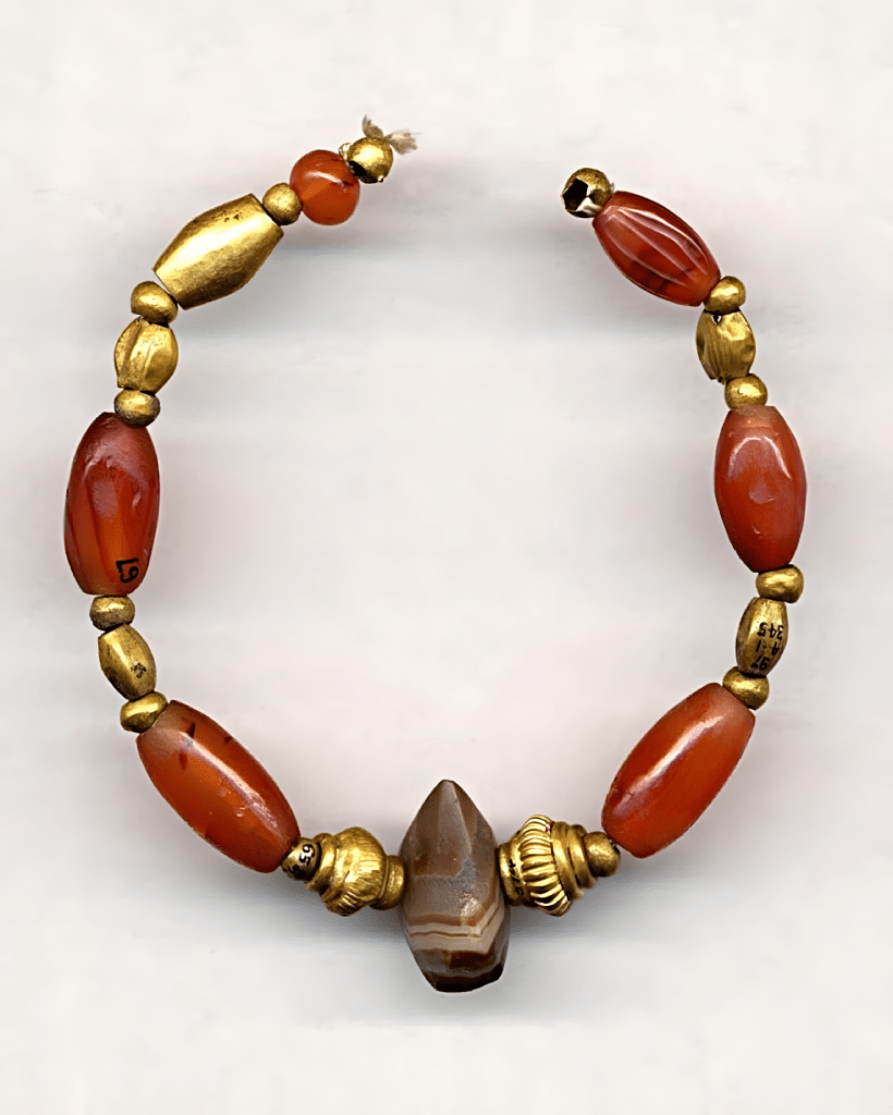 이들 황금 카르넬리아 그리고 마노 구슬 세트는 키프러스 엔코미 마을에서 발견되었다.