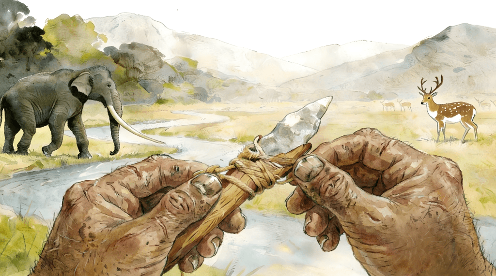 가장 주목할 만한 발견 중 하나는 자루 달린 석기hafted stone tools 발견이다.