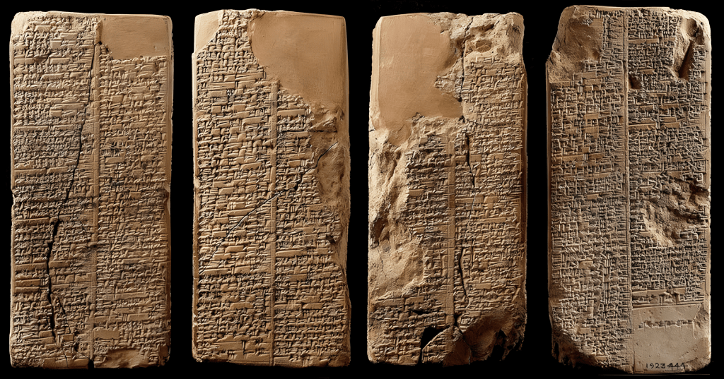 이 희귀하고 독특한 문서의 첫 번째 조각인 4,000년 된 쐐기 문자 점토판은 1900년대 초 독일계 미국인 학자 헤르만 힐프레히트Hermann Hilprecht가 고대 니푸르Nippur 유적에서 발견했으며, 그의 연구 결과는 1906년에 발표되었다.