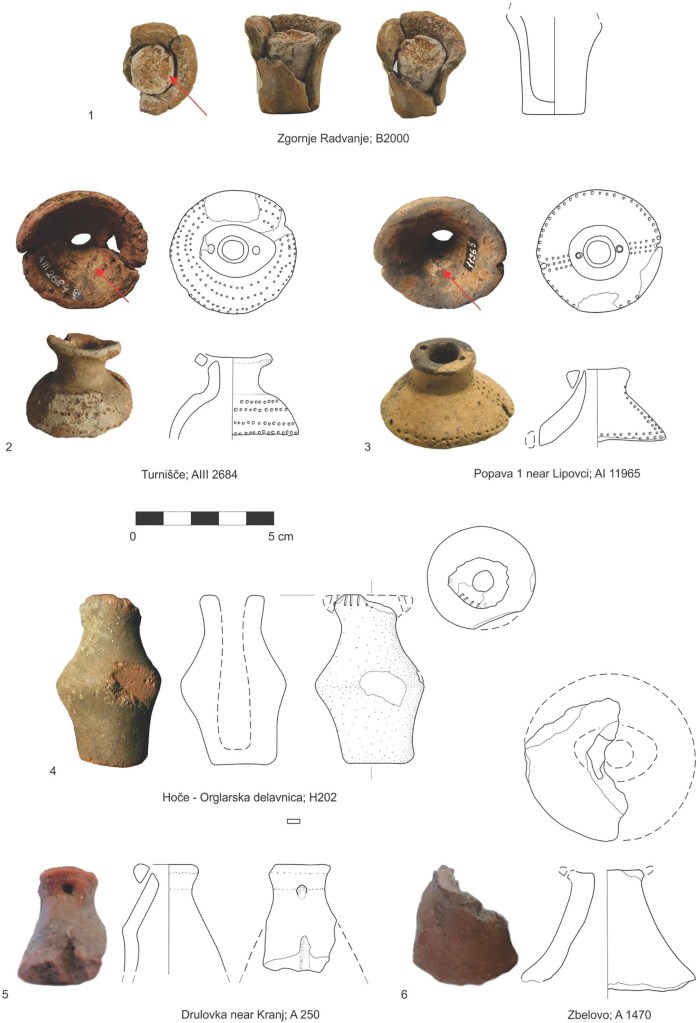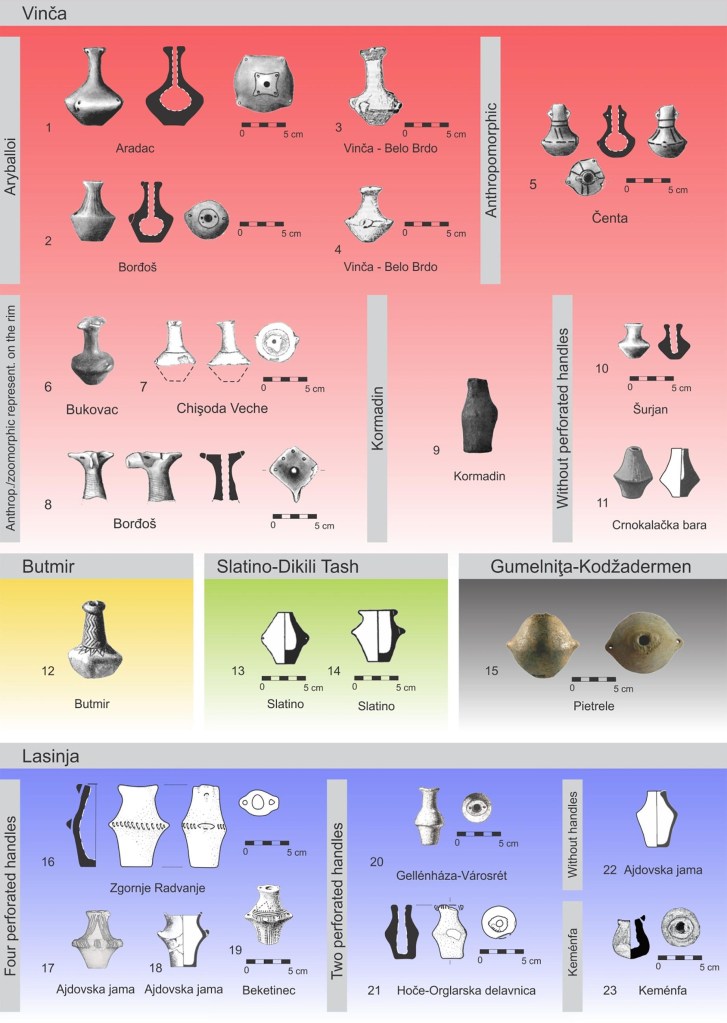 현재 세르비아 영토 내 베오그라드 인근 빈차-벨로 브르도Vinča-Belo Brdo에서 이루어진 신석기 시대 발굴과 남동부 프레알프스와 크로아티아 북부에서 발견된 라신야 문화 첫 유적들을 고려할 때, 기원전 4천년대 무렵의 구멍 뚫린 손잡이perforated handles가 있는 작은 원뿔형 병 모양biconical bottle-shaped 토기 용기goal에 대한 연구는 많은 추측을 불러일으켰다.