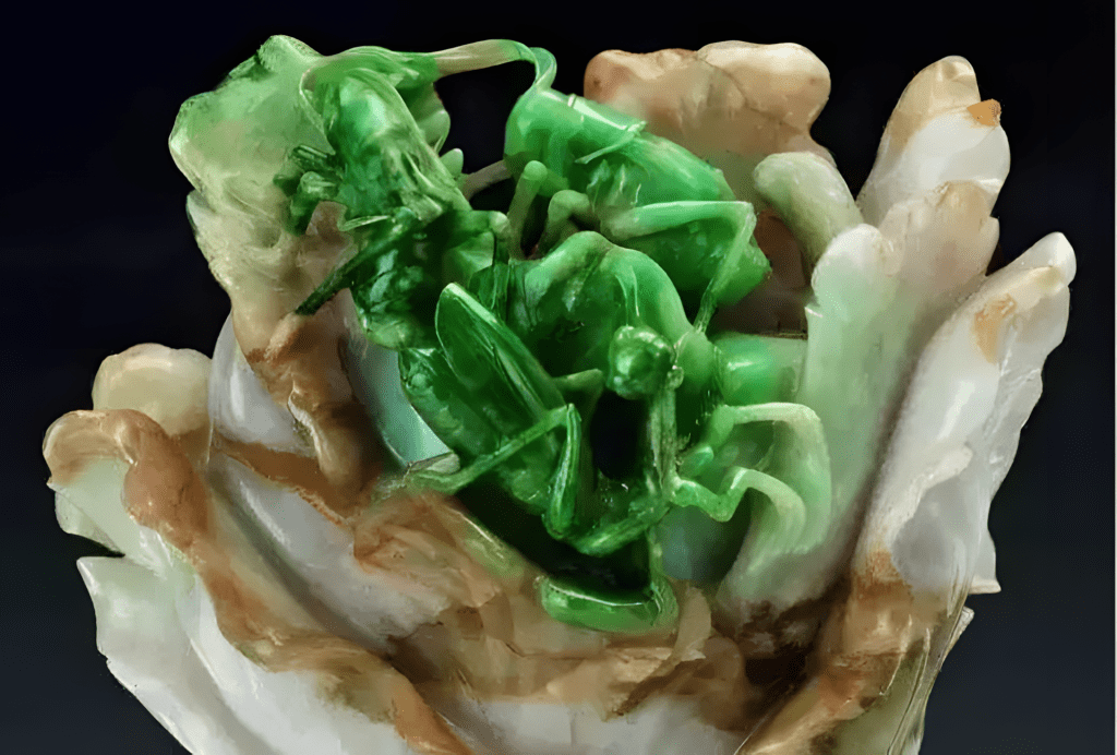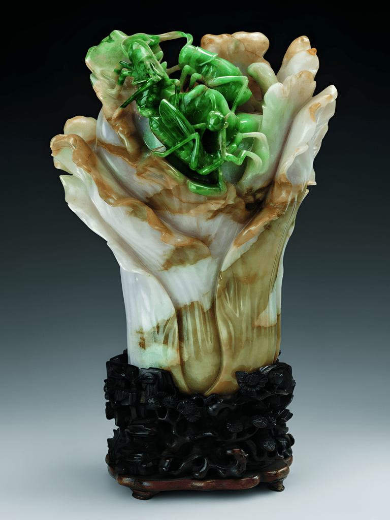 천진박물관天津博物馆 소장 청나라 시대 비취 배추 메뚜기 조각[비취괵괵백채翡翠蝈蝈白菜]은 희귀한 초색 작품이다.