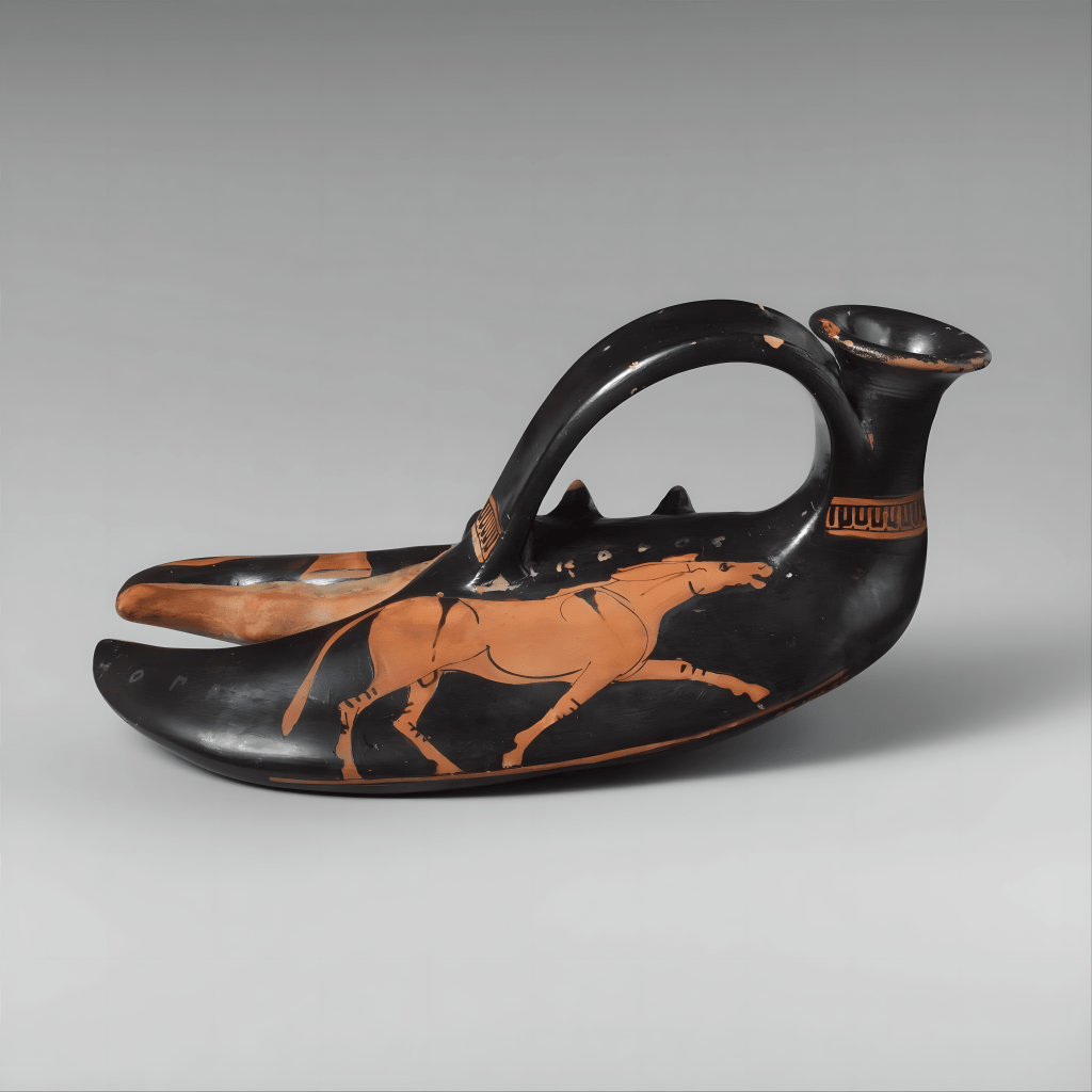 One of those artefacts that needs to be shared immediately after discovering it exists – an ancient Greek red-figure terracotta oil lamp in the shape of a lobster claw with horses decorating it.
