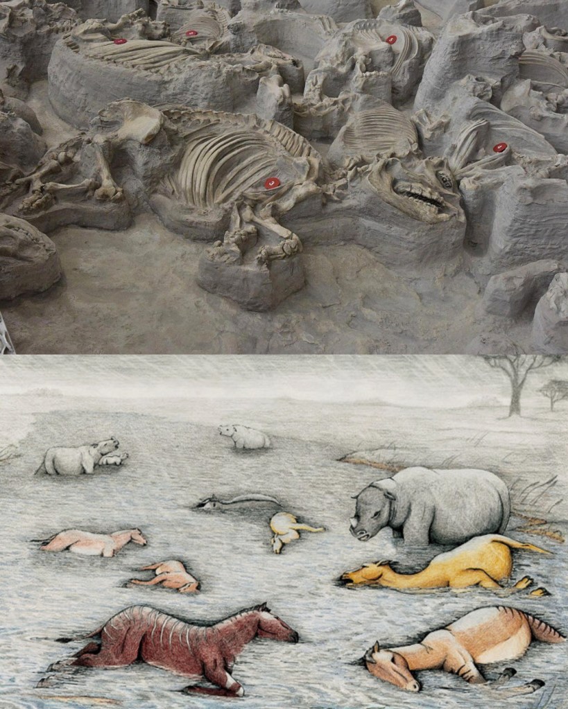 시간이 흐르면서 미세한 화산재 층이 초원과 물웅덩이에 쌓이면서 수많은 선사시대 동물 화석이 보존될 환경이 조성되었다.