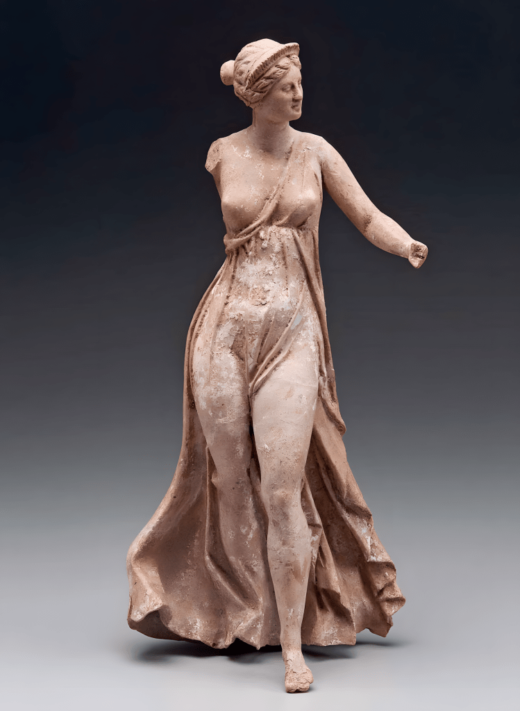 드러난 가슴exposed breast (파이노메리스 양식phainomeris style)과 페플로스peplos의 정교한 디테일은 세련된 미리나 양식Myrina style의 특징이다.