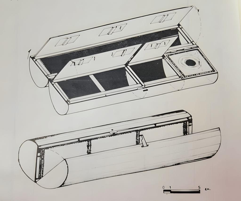 A diagram illustrating the compartments and folding mechanisms of the writing case. It is theorised that the owner’s papyrus sheets may have been rolled around the cylindrical case for travel.