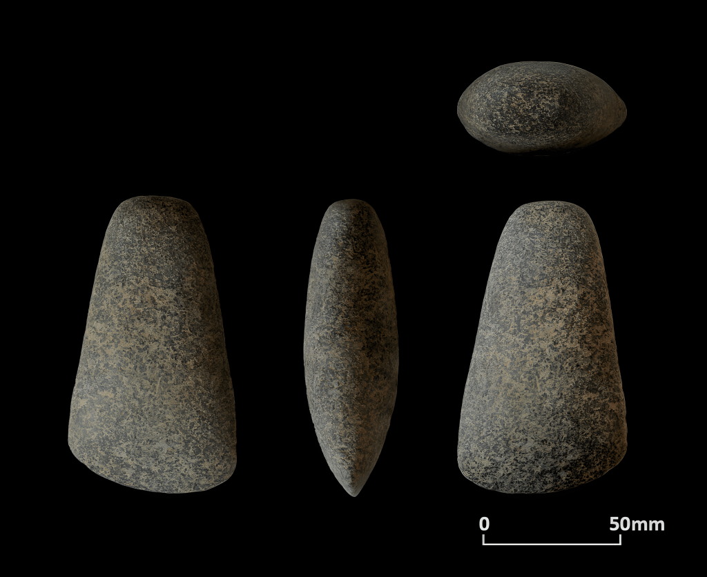 This stone axe head would have been hafted in a handle typically made from wood or occasionally antler. It has been well finished, by being finely pecked and ground, rather than polished, and it shows evidence of use.
