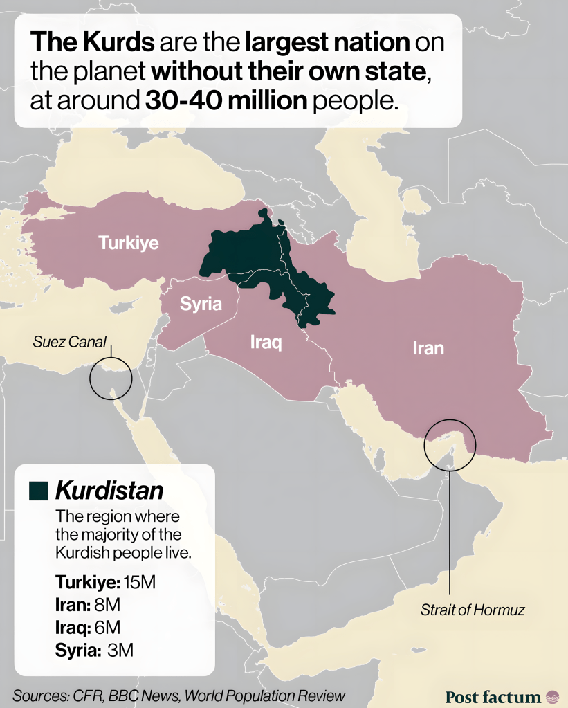 The Kurds are an ethnic group of 30-40 million people living mostly in Turkiye, Iraq, Iran and Syria.