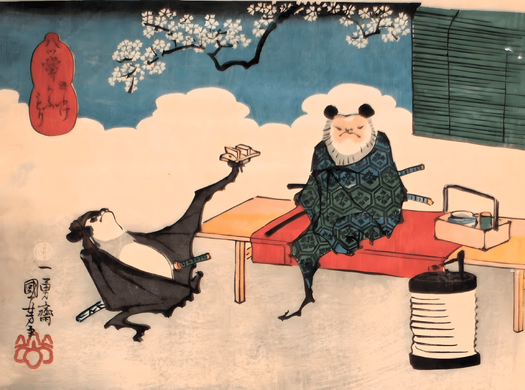The artwork I’m sharing is a parody of Sukeroku Yukari no Edo Zakura, one of the most famous kabuki plays of its time. The cherry blossoms in the background serve as a visual nod to the phrase “Edo Cherry Blossoms” in the play’s title. The bat on the left, with its purple headband and black appearance, plays the main character, Sukeroku. The white-bearded figure on the right takes on the role of the story’s main villain, the old samurai Ikyu. In the original play,